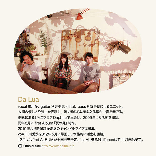 東京・神奈川を中心に活動するユニット「Da Lua」(vocal 市川愛 guitar 秋元勇気[citta] bass片野吾朗)を迎え、バーにふさわしい、柔らかくも力強い表現豊かなボーカルから紡ぎだされる、優しい音に包まれる空間を創りだしていきます。