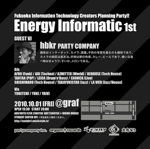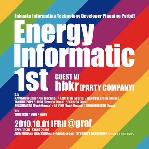 天神の親富孝通りにある「graf」にて10/1(金)、デザイナーやプログラマーなどの福岡で活躍するITクリエイターが集まるクラブイベント「Energy Informatic 1st」を開催します。”アート”をテーマに、DJとVJが創りだす音と映像と光の世界、さらにデザイナーのイラストや絵画なども展示します。第一線で活躍する福岡のITクリエイターたちが勢ぞろいする、またとない機会!新しい出会いと、コミュニケーション、そして、アートな秋をお楽しみください☆
