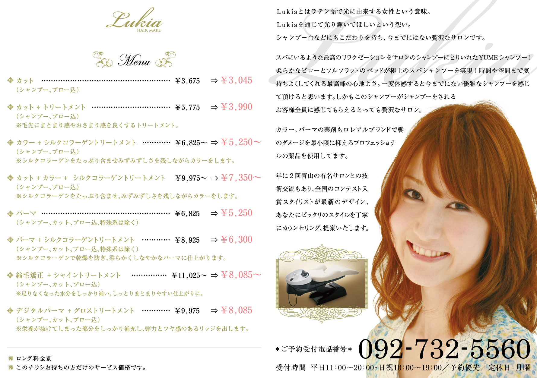 108月 2009 投稿者: Incline Salon Information Flier A5 コート110kg 4c/4c 2つ折 Client: Lukia Design: Reiko Nagata (Incline)