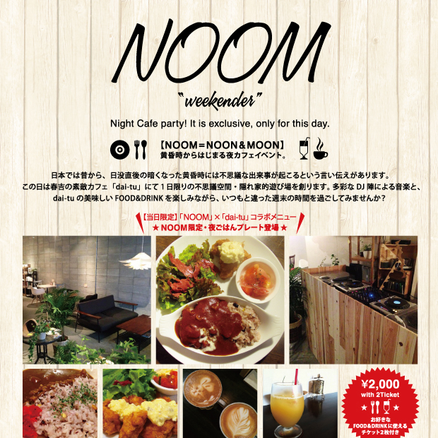 昼と夜でガラッと雰囲気が変わるカフェで、多彩なDJ陣による音楽と、美味しい食事やスイーツ、ドリンク楽しみながら、いつもと違った日曜日の夜を過ごしてみませんか?