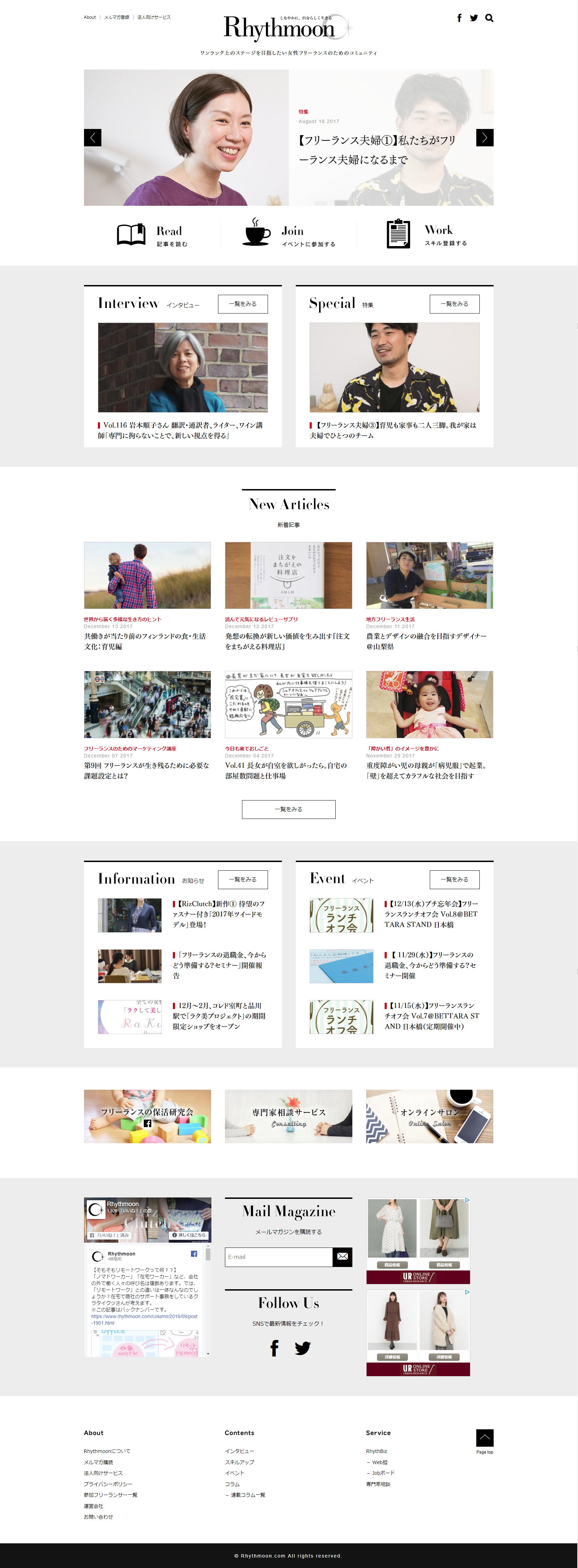 1512月 2017 投稿者: Incline フリーランスという雇われない働き方を選び、 しなやかに、自分らしく生きる女性を応援するプラットフォームサイト「Rhythmoon(リズムーン)」のサイトリニューアルデザインをさせて頂きました。