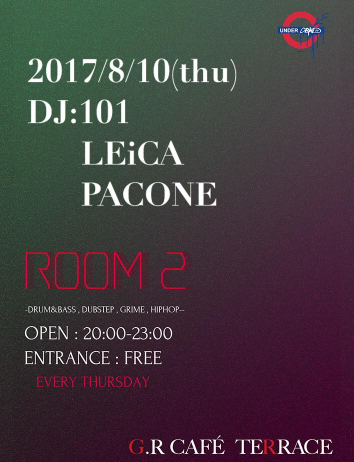068月 2017 投稿者: Incline 2017.8.10.Thu. @ G.R CAFÉ TERRACE 大阪市中央区西心斎橋2-13-13 ショウザンビルB1-A ROOM 2 DJ:101, PACONE, LEiCA 20:00~23:00 ENTRANCE:FREE
