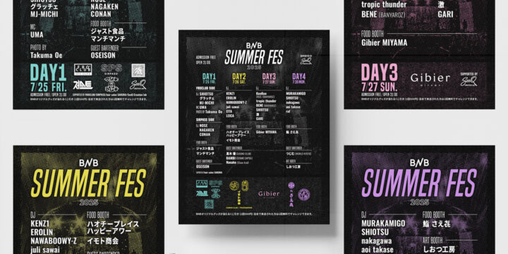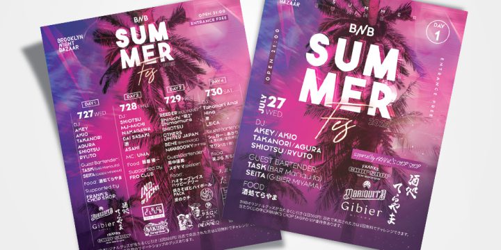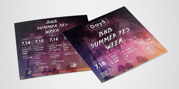 京都BROOKLYN NIGHT BAZAARのBNB SUMMER FES WEEK フライヤー(全日程&各日程)のデザインをさせていただきました。 FlyerAD/D: Reiko Nagata (Incline)