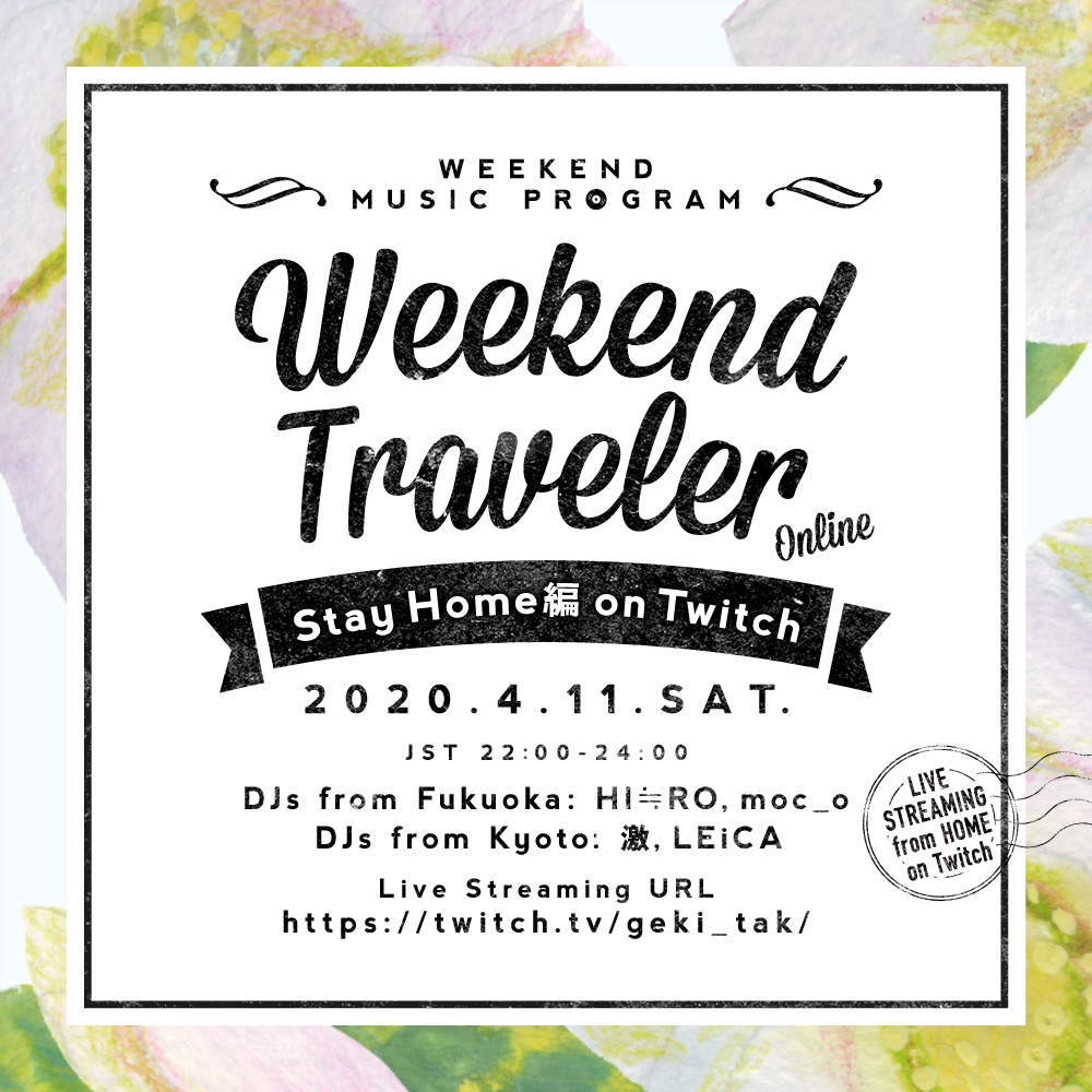 Weekend Traveler ONLINEは、DJがそれぞれの居る場所をライブストリーミング配信プラットフォーム “Twitch” 経由で繋ぎ、1つのチャンネルから配信するオンラインイベントです。