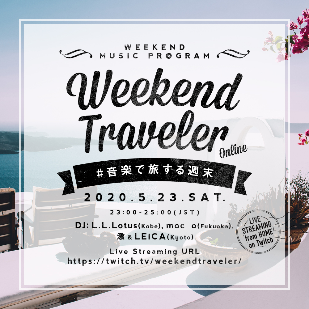 Weekend Traveler ONLINEは、DJがそれぞれの居る場所をライブストリーミング配信プラットフォーム “Twitch” 経由で繋ぎ、1つのチャンネルから配信するオンラインイベントです。
